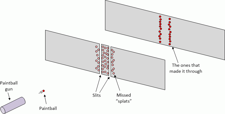 Si estuvieras disparando cañonazos a una pared a través de dos rendijas, esperarías que las bolas de cañón golpearan aproximadamente detrás de una u otra rendija. Después de disparar varias veces verías dos franjas verticales con todos los impactos.