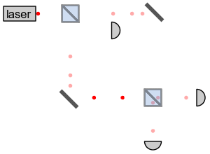 Lanzamos un fotón desde el láser, arriba a la izquierda, y este atraviesa un cristal polarizado que el 50% de las veces lo manda hacia abajo y el otro 50% lo deja pasar en línea recta. Después el fotón rebota en un espejo y se enfrenta a otro cristal polarizado que lo mandará hacia el detector de fotones de abajo o hacia el de la derecha.