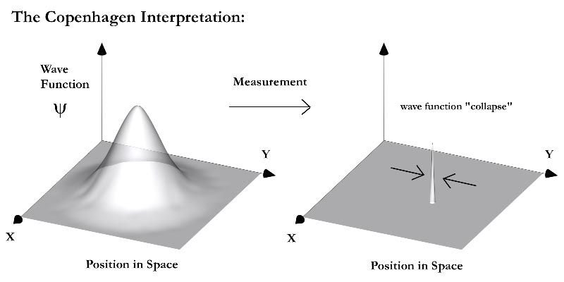 A la izquierda vemos la función de onda, a la derecha, el lugar donde colapsa la función cuando se realiza una medición