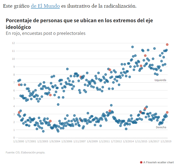 Evolución de los últimos 20 del porcentaje de personas que se ven en los extremos políticos en España