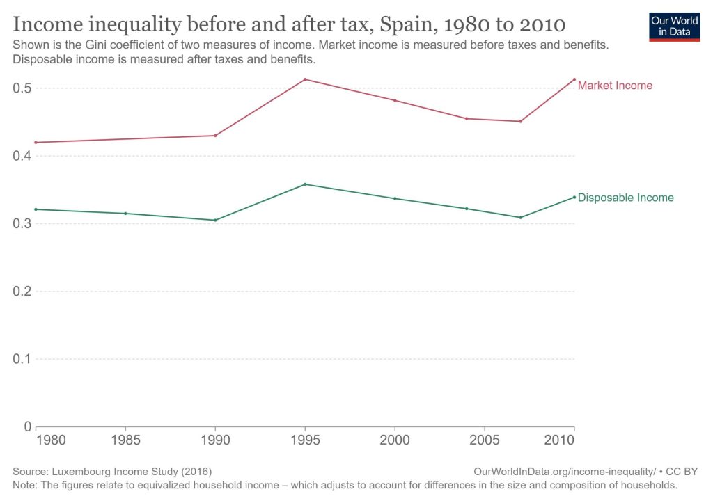 Evolución de Gini en España antes y después de impuestos